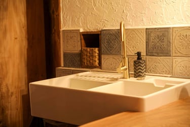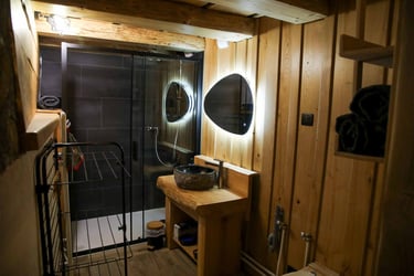 Une salle d'eau avec lavabo, douche et toilettes sèches